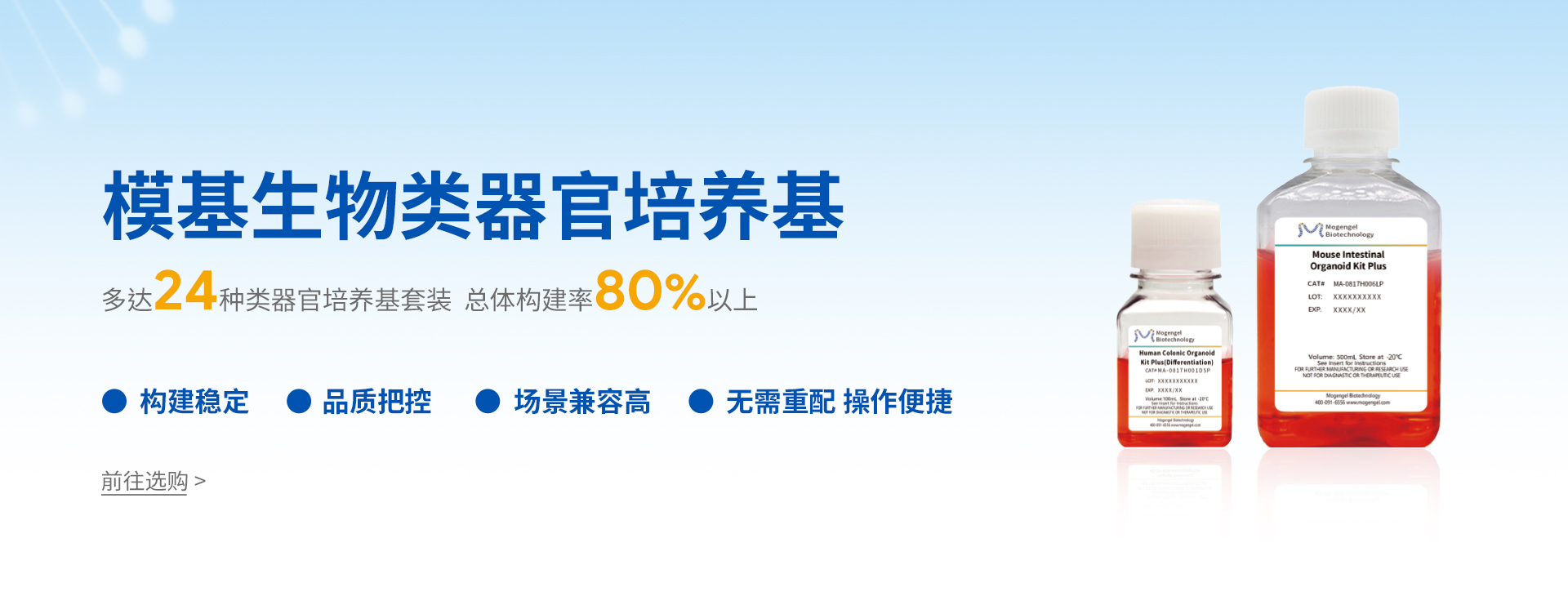 廈門模基生物科技有限公司致力于3D細胞培養(yǎng)核心原材料的研發(fā)與產業(yè)化升級,是國內一家從科研做起,從實驗研究中一路走來的全流程自主研發(fā)、自主生產的企業(yè)。目前公司的產品有基質膠、類器官培養(yǎng)基、細胞因子、3D細胞培養(yǎng)耗材、3D細胞培養(yǎng)智能顯微鏡等。公司擁有4大技術研發(fā)中心:分子克隆和細胞編輯中心、實驗動物中心、蛋白表達和純化平臺、類器官質檢系統和自動化。
